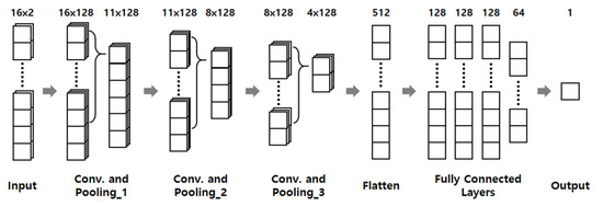 To estimate the required joint torque from the reference EMG, a combination of a 1D CNN and a fully connected MLP were employed in this study. The structure of CNN–MLP model is illustrated in Figure 4. In the network model, there were three 1D CNN layers in the series. Each 1D CNN had a convolution and pooling layer. The three convolution layers had a kernel size of 16 and a filter size of 128, and the three pooling layers had pooling sizes of 6, 4, and 2. The three 1D CNNs compute the convolution with stride lengths of 1, 0, and 1. After the 1D CNNs, the flattened layer was located to match the dimensions of the dataset. Following the flattening layer, five fully connected MLPs with layer sizes of 129, 128, 128, 64, and 1 were used in the series. For the activation functions of MLPs, the first four MLPs used rectified linear unit (ReLU), whereas the last MLP used a hyperbolic tangent function (Tanh) to take nonlinearity into account. For model training, the Adam optimizer was employed, which was stable and effective in training a DNN.