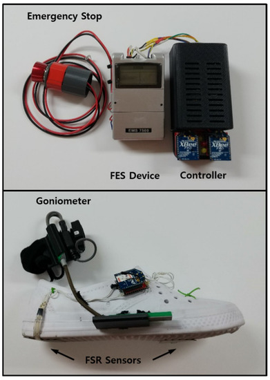 A pair of customized shoes with four FSR sensors (Ohmite Manufacturing Co., Rolling Meadows, IL, USA) was used to detect foot–ground contact at the heel and toe in contact. The FSR sensors were attached to the soles of the heel and the first metatarsal head of the shoes. To measure the joint angles at the ankles, goniometers were taped to the shoes. The signals from the sensors were transmitted to the microcontroller unit using XBee modules (Digi International, Minnetonka, MN, USA) attached to the lateral sides of the shoes. The total weight of the shoe and the wireless communication module was about 120 g, which is light enough to barely affect normal walking.