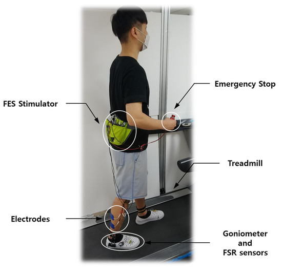 In the proposed rehabilitation system, the ground reaction forces on the unaffected and paretic sides were measured using force-sensitive resistors (FSR) to determine the gait phase and walking speed on the paretic side. With the gait phase and walking speed, the reference EMG envelopes for the muscles on the paretic side were determined. As it is difficult even for the patient’s unaffected side to perform the muscle activities yielding normal, natural gait patterns, the reference EMG data were acquired from healthy subjects. Subsequently, the envelopes of the EMG signals were functionalized for various walking speeds. With the functionalized EMG envelope as the input, a DNN model predicted the joint torque for a specific gait phase, which enabled natural ankle movement of the paretic side. Using the linear model between the joint torque and FES intensity, the amplitude of the FES was determined based on the joint torque estimated by the DNN model. The FES signal applied to the muscles on the paretic side was controlled based on the foot–ground contact information.