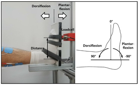For the isometric contraction tests, a customized device was built for this study, as shown in Figure 9. This device restricted the motion of the ankle joint and measured the joint torque in both plantar flexion and dorsiflexion. The joint torque could be calculated by the product of the force, measured by the load cell, and the distance between the load cell and ankle joint.
