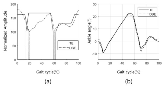 Figure 10 shows a typical experimental result during treadmill gait at a walking speed of 3 km/h. Figure 10a plots the FES results for the TE and DBE, and Figure 10b compares the ankle joint angles generated by FES-induced muscle contractions in the cases of the TE and DBE. Figure 10b shows that the difference between the two joint angles was conspicuously between 55 and 90% of the gait cycle, which corresponded to the period from the maximum dorsiflexion in the stance phase to the mid-swing phase. The largest difference occurred at 70% of the gait cycle around the maximum plantarflexion of −5.969 and −8.203 for the TE and DBE, respectively. A larger plantarflexion of the DBE case suggested that the soleus was stimulated more effectively to produce a higher thrust force during the stance phase.