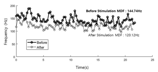 FES-induced muscle fatigue could be estimated based on the changes in EMG before and after FES stimulation. As an index to assess muscle fatigue, changes in the median frequency (MDF) of EMG signals are commonly used [41]. A decrease in the MDF of the EMG signal indicated the amount of muscle fatigue. Performance of the DBE and TE were compared based on the decrease in MDF of the EMG signal before and after FES application.