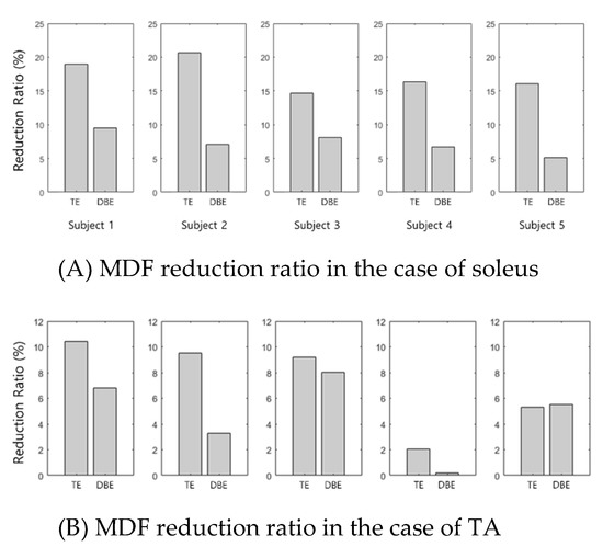 Figure 13 compares the reduction ratios of the MDFs of the EMG signals after each stimulation using the TE and DBE. Figure 13a shows that the reduction ratios of MDF in the soleus were smaller with the DBE for all subjects. This result demonstrates that FES-induced fatigue in the soleus could be significantly alleviated using the DBE. However, unlike in the soleus, the difference between the reduction ratios with the DBE and TE appears to be insignificant in the TA, as shown in Figure 13b.