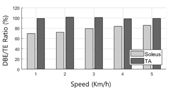 The consideration of electric energy consumption was critical for the operation of battery-operated FES devices. Efficient FES control can decrease battery energy consumption to enable longer operation times. The time integral of the FES signal applied to the muscle can be used to indicate the electric energy consumption by the FES device. Figure 14 compares the time integrals of the FES signals generated by the TE and DBE over one gait cycle. The ratio of time integral with the DBE to that of the TE was computed for the FES from the soleus and TA at five different gait speeds. Therefore, the electric energy distribution by the DBE amounts to between 70 and 90% of that of the TE in the soleus. In the TA case, the ratio was nearly 100%, showing no advantage of the DBE over TE. Consequently, the electric energy consumption and FES-induced fatigue could be reduced by using the DBE, which is advantageous in the battery management of FES devices.