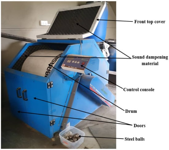The representative feed olivine sand particles (approximately 3000 g), together with the grinding steel balls, were fed into an Eco-smartz Los Angeles Abrasion machine (Code: NL 1008 X/003) (see Figure 1) for grinding. The technical specifications of the abrasion machine are given elsewhere []. The abrasion machine was adequately cleaned before feeding the olivine particles to prevent contamination, and the machine was then set to begin the grinding. After each grinding duration (200 min), the abrasion machine was stopped, and the contents were removed cautiously and poured into a tray. This procedure was repeated for all the representative feed samples. In this study, 9 steel balls of 0.441 kg, on a 3000 g bed of olivine sand particles upon grinding for 200 min is ideal for obtaining fine olivine size particles (−75 µm), based on our previous investigation []. The particle size distribution of the product from the breakage process were then analyzed using the sieve analyses. Precaution was taken to ensure that the sieves were not clogged, and a sieving time of 20 min was employed using a mechanical sieve shaker. Details about the comminution of olivine sand particles using the Los Angeles abrasion test and employing the AR method for the analysis are given elsewhere []. In order to better understand the application of the AR method in the optimization of olivine sand comminution, the authors would therefore like to invite interested readers to visit the study. In summary, the AR analysis of our previous study demonstrated that the use of 9 steel balls of 0.441 kg on a 3000 g bed of olivine sand particles upon grinding for 200 min is ideal for obtaining fine olivine size particles (−75 µm), which are required for achieving significant hydraulic conductivity reduction since the reactivity between the soil and olivine increases with the fineness of the olivine particles.