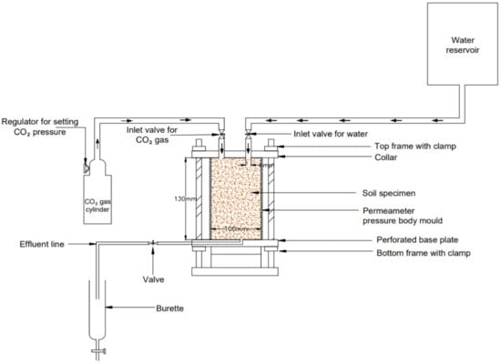 where K is the hydraulic conductivity (cm/s); A is the cross-sectional area of the specimens (cm/s); a is the cross-sectional area of the flexible tube (cm/s); L is the height of the specimen (cm); h1 is the initial height of permeant; h2 is the final height of permeant; ∆t is the time required for the total head to drop from h1 to h2.