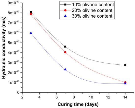 Similarly, the hydraulic conductivity of the olivine-admixed samples decreased further after seven and 14 days of curing (see Figure 3). The hydraulic conductivity declined from 8.26 × 10−10 m/s for the natural clay to 2.74 × 10−10 m/s, 1.02 × 10−10 m/s, and 9.08 × 10−11 m/s for 10%, 20%, and 30% olivine-admixed clay samples, respectively, after 14 days of curing. This finding also indicates that, with an increase in curing duration, the sizes of the inter-aggregate pores decrease, due to the excessive formation of the hydration products, which fills the pores and bind the clay particles together, forming packed and compacted clay particles, thus decreasing the hydraulic conductivity.