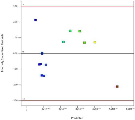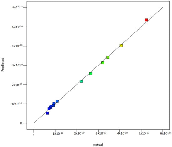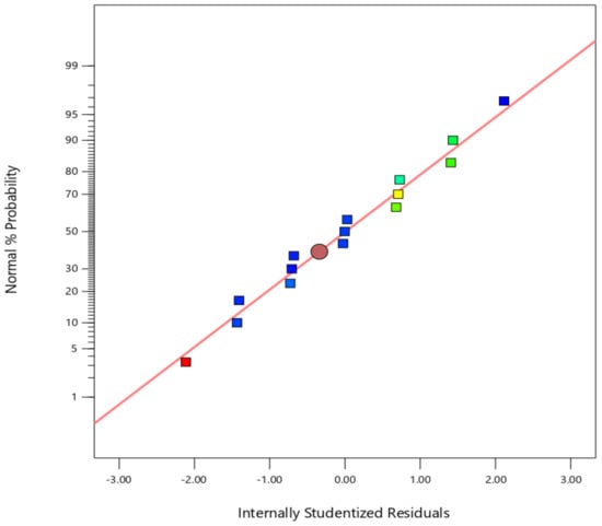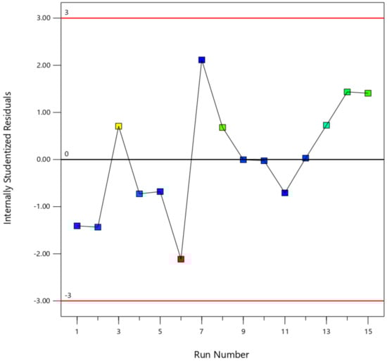 The residual plots (Figure 4, Figure 5, Figure 6 and Figure 7) were analyzed to check the developed model’s adequacy. The plot of the normal probability versus the internally studentized residuals is shown in Figure 4. As portrayed in the figure, the internally studentized residuals do not deviate considerably from the normal probability line as they are distributed along vertical trajectories, suggesting that they were normally distributed in the model response. Thus, indicating the model’s accuracy in describing the relationship between the independent and dependent variables. A suitable model can also be determined based on the distribution of data points around the mean of the response variable. Figure 5 displays the internally studentized residuals versus the predicted values. From the figure, a random distribution of the residuals between ±3.0 is noted. Thus, indicating that the approximation of the fitted model to the response is reasonably valid with no data recording high error; hence the model is good and reliable in predicting the response. Figure 6 illustrates the relationship between the values of the predicted response and the actual values. It is observed from the figure that the predicted values are in good agreement with the actual values in the operating variable range since most of the values lie along the diagonal line. Therefore, the model is accurately describing the experimental data. Figure 7 portrays the internally studentized residuals versus the run number to assess the satisfactory fit of the developed model. An arbitrary pattern was detected in the residuals vs. run plot, and all the data points fell within the range of control limits (i.e., ±3.0). This indicates the experiments were conducted randomly, thus minimizing any chance of errors and ensuring a good fit. From the observed pattern in Figure 4, Figure 5, Figure 6 and Figure 7, it is evident that the established model can reliably predict the experimental data.