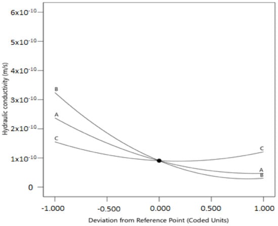 To demonstrate the correlation between the response (hydraulic conductivity) and the independent variables, a perturbation chart (Figure 8) was generated to evaluate the individual and shared effects on the response. It can be observed from Figure 8 that, by increasing the contents of the independent variables, the hydraulic conductivity of the carbonated specimen decreases gradually. Nonetheless, the hydraulic conductivity reduction with increasing carbonation pressure (C) was not very pronounced relative to the other two factors (olivine content (A) and carbonation time (B)). This is also confirmed with a relatively high p-value for carbonation pressure (0.0072) relative to the olivine content (<0.0001) and carbonation time (<0.0001) from the ANOVA analysis.
