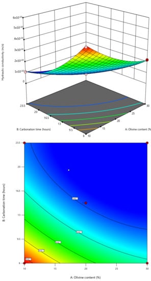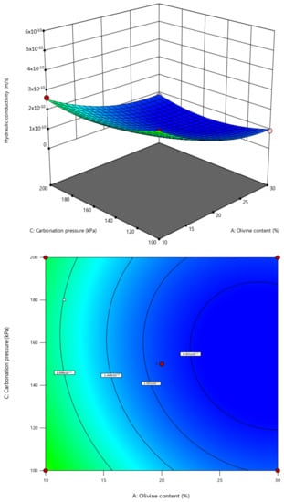 - The quadratic model was considered the best fitted and non-aliased model between the control factors and response. ANOVA analyses revealed that the main and quadratic effects of olivine content, carbonation time, and carbonation pressure significantly affected the hydraulic conductivity.