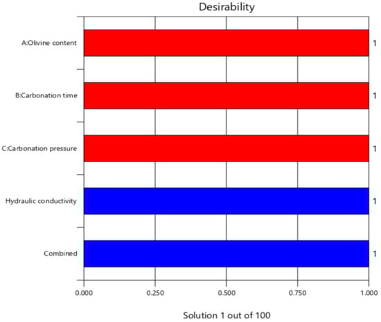 The use of the desirability function for each factor with the pre-selected goal gave an optimized specific response value (see Table 7) and presented in Figure 13 for solution number 1. The ideal hydraulic conductivity value of 2.0 × 10−11 m/s was attained at 24.7% olivine content, 20.1 h carbonation time, and 161 kPa carbonation pressure, with a designated maximum desirability function (D = 1.0). Furthermore, 100 desirable solutions for attaining suitable hydraulic conductivity values are recommended. However, only the first 20 of the suggested solutions are reported in this manuscript for the sake of simplicity (see Table 7).