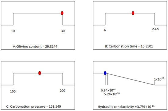 - Based on the optimization study, the optimum value of the hydraulic conductivity was suggested as 2.0 × 10−11 m/s and was attained under the following operating conditions: 24.7% olivine content, 20.1 h carbonation time, and 161 kPa carbonation pressure, with a designated maximum desirability function (D = 1.0).