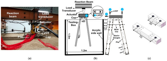 The equipment and loading method of the test are shown in Figure 3, where Figure 3a shows the test photo, Figure 3b shows the arrangement of sensors, and Figure 3c shows the cap with a variable pile spacing.