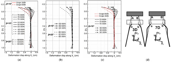 It can be seen from Figure 4a that the deformation mainly occurs in the upper pile section (≤0.2L). As shown in Figure 5b,c, the maximum deformation value increases with the pile inclination β and pile spacing D. When the pile inclination β changes from 10° to 20° or the pile spacing increases from 5D to 7D, the deformation value increases by more than twice. When the pile spacing increases to a certain value (7D in this paper), negative deformation displacement appears, as shown in Figure 4c.
