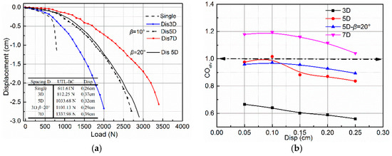 The pile group effect is defined in Equation (5), where UVnD and UVsingle represent the loads of the symmetrical and single batter pile under the same displacement, respectively (below the failure load), and n is the number of piles in the pile group, which equals 2 in this paper. The lower the coefficient, the more significant the pile group effect. The results are shown in Figure 8b.