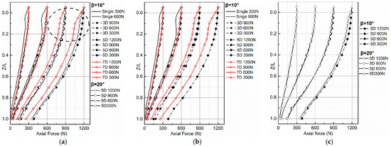 The variation in axial force along depth: (a) axial force of all tests, (b) axial force when β = 10°, and (c) axial force β = 10° vs. β = 20.