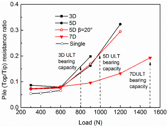 Figure 9 shows the variation in the pile tip resistance ratio under different loadings. The position indicated by the dashed arrow is near the ultimate bearing capacity of each test. It can be seen that when the loading is within 300–600 N, the pile tip resistance ratios are the same. This indicates that the pile skin-friction along the pile axis is not fully activated. As the load increases, the pile tip resistance shows a nonlinear increase. The ratio is negatively correlated with the pile spacing.