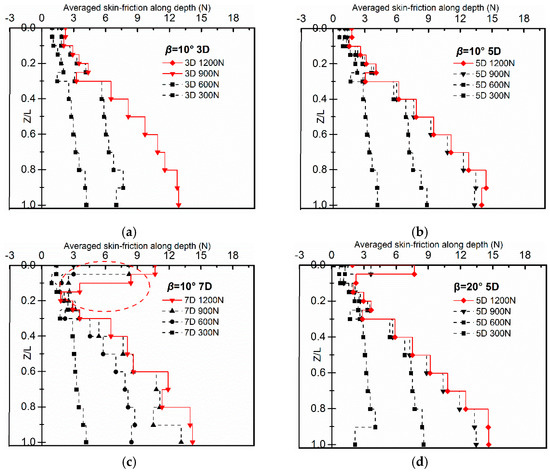 The variation in averaged skin-friction along depth: (a) β = 10° pile spacing = 3D, (b) β = 10° pile spacing = 5D, (c) β = 10° pile spacing = 7D, and (d) β = 20° pile spacing = 5D.