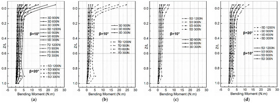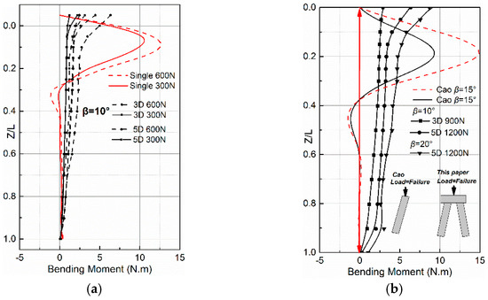 Figure 12 shows the comparison results, where Figure 12a shows the test results of this paper with different loadings (only loads below 600 N are shown, because 600 N is close to the failure load of the single batter pile), and Figure 12b shows the comparison between Cao and this paper under the load close to failure. It should be noted that in Cao’s experiment, the free length is basically zero, so only the bending moment below the mud-line is analyzed.