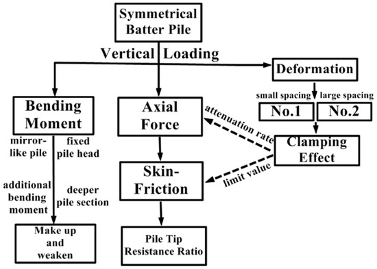 The load transfer mechanism of flexible symmetrical floating batter piles under vertical loading is summarized in Figure 13. Due to the constraints of the cap and the mirror-like batter pile, the deformation of the symmetrical batter pile appears as an inward bending of the upper section. The deformation causes the soil between piles to be compressed and result in the “clamping” effect. The “clamping” effect will increase the attenuation rate of the axial force and the limit value of the skin-friction, which indirectly affects the pile tip resistance ratio. Moreover, the symmetrical conformation can weaken the additional bending moment effect and reduce the concentration and maximum of the bending moment. Therefore, in engineering practice, the difference between symmetrical and single piles and the influence of “symmetry” on the bearing capacity and load transfer should be fully considered.