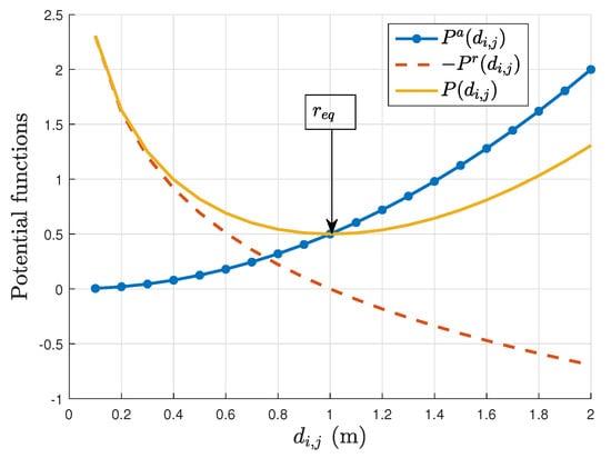 Where and are, respectively, attractive and repulsive potential fields. An example of such potential fields are shown in Figure 1. It is a reactive approach to guidance where the trajectory is not planned. Since is convex, we can directly use the sign of its gradient to describe the behavior of agents i and j. If the gradient is positive, then agents i and j will repel each other. If the gradient is negative, then agents i and j will attract each other. The agent will stop when it attains an equilibrium distance between agents i and j, where the potential function is null and stable in the sense of Lyapunov [12,35,38]. Collisions between neighbors in the swarm are thus avoided and the inter-agent distance is controlled owing to near-equilibrium distance parameter . Hence, the swarm will attain a stable formation, when individually each agent minimizes its potential function, whatever the initial position of the agents. When the swarm is stable, there is a velocity matching between the agents [12,46]. Ref. [47] use the consensus metric as follows:
