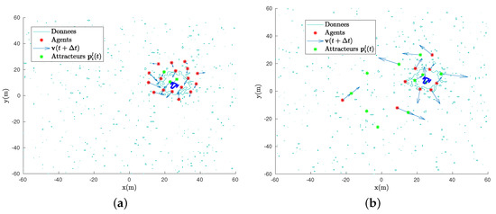 Hence, if the swarm is stable in the sense of Definition 2, all agents follow the speed vector of the center of gravity. Taking into account the inertia weighted by , the attractor position gives the direction that the swarm will follow. In the MOSL case, we have defined it as the agent that has measured the strongest information at time t; it is thus the agent that is the closest to the target.