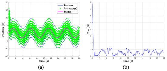 We distinguish two particular states. The first one is the transition state, with . In this state, the attractors are necessarily and intuitively the agents located on the hull of the swarm: . Trying to catch up with these attractors, the agents in the swarm will accelerate to their maximum speed and then remain at this speed, in a steady state. Thanks to (17) and , the maximal speed is predictable. This state is illustrated in Figure 2b in dimension 2. The second case is the steady state, with . In this state, all agents of are potentially attractive, that is, . In this case, the swarm will follow a speed close to that of the target. Thus, the closer the attractor is to the center of gravity, the slower its speed will be. In the case of tracking a static target, our swarm will head towards the source, and will stop when , shown in Figure 2a in Dimension 2.