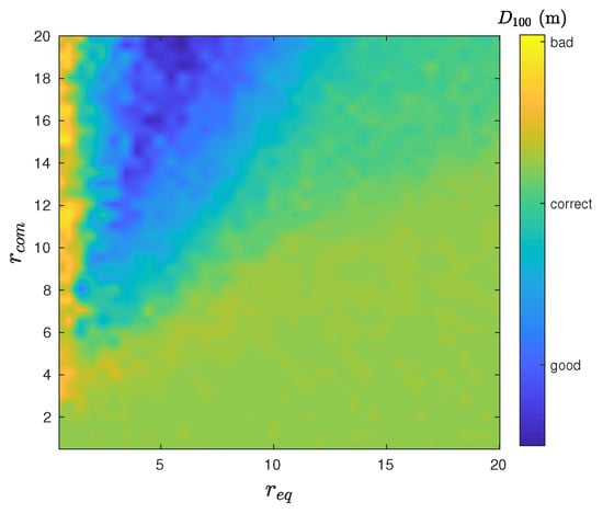 First, to reflect limitations in communication links, a local communication constraint is added to the model. Indeed, the best tracker position of the swarm in Equation (9) is global, shared with each agent of the swarm. We use the local-best vector position (l for local), which is the position of tracker j in the neighborhood set of i where measure is the greatest. The neighborhood set is based on parameter which denotes the maximum communication range between tracker i and its neighbors [12]. Beyond maximum communication range data transmission is impossible, below transmission is perfect:
