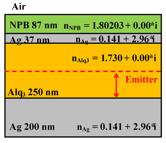 Figure 2 shows the multilayer structure of a top-emitting OLED, which is taken from [25]. The device is composed of 100-nm Ag as a reflective bottom anode, 250-nm Alq3 (tris-(8-hydroxyquinoline) aluminum) as an EML, 37-nm Ag as a semi-transparent top cathode, and 87-nm N, N-bis(naphthalen-1-yl)-N, N-bis(phenyl)-benzidine (NPB) as the capping layer. All results are calculated at the wavelength of λ = 520 nm, which corresponds to the photoluminescence peak of Alq3 in the literature [6]. The complex refractive indices of the materials shown in Figure 2 are obtained from the literature [26,27]. As organic materials in an OLED have relatively similar refractive indices [28,29,30], it is sometimes considered that all organic layers such as the electron transport layer and EML have the same refractive index value [31] or assumed that all the organic layers are integrated into the one organic layer. In Figure 2, it is assumed that both exciton generation and carrier transport occur at the EML. This simple structure of the top-emitting OLED is better to show the calculation results and optical analysis, which makes it easier and more intuitive for readers to understand the theoretical model and analysis of the NF absorption. The dipole emitter assumes to have a delta function distribution, which is positioned zex away from the interface between the Ag reflective bottom anode and EML.