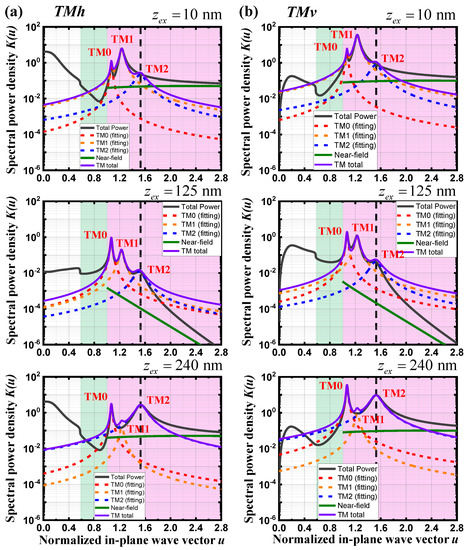 In Figure 4, the aggregate spectral power density of the SP-like TM modes, obtained by summing all the spectral responses of three TM modes, is significantly different from the total spectral power density calculated based on Equation (17) in the evanescent region of u > 1. For the dipole positions of zex = 10 and 240 nm, the aggregate spectral power density of three SP modes is less than the total spectral power density at the spectral region of u > 1.523, which corresponds to the spectral peak position of the SP-like TM2 mode. In contrast, the aggregate spectral power density caused by three SP modes is greater than the total spectral power density when the dipole position is zex = 125 nm. In Figure 4, the spectral response of the NF absorption, calculated based on Equation (30), is also plotted in the evanescent region of u > 1. For all the dipole positions, the spectral response of the NF absorption becomes closer to the total spectral power density at the larger normalized in-plane wave vectors. Thus, the contribution of the NF absorption to the total power dissipation spectrum becomes more important than that of the SP modes when the in-plane wave vector becomes very large in the evanescent region.