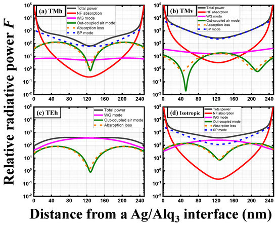 In Figure 5a,b, the TM-polarized relative radiative power emitted by the vertically oriented dipole is more coupled to the evanescent wave of SP modes and NF absorption than that radiated by the horizontally oriented dipole. On the other hand, the vertically oriented dipole provides smaller relative radiative power to both the out-coupled air mode and absorption loss than the horizontally oriented dipole does. This fact results from the angular radiation pattern of a Hertzian dipole emitter [12,14,22]. Regarding the out-coupled air mode and absorption loss, the relative radiative power emitted by the horizontally oriented dipole has the maximum intensities at the emitter positions of around 50 and 200 nm and the minimum intensity at the emitter position of around 130 nm. In contrast, the relative radiative power radiated from the vertically oriented dipole has the opposite emitter position of the maximum and minimum intensities. This out-of-phase difference of maximum and minimum intensities between horizontally and vertically oriented dipoles is ascribed to the combined effects of the phase difference induced by the Ag metal anode and the initial phase relation of the emitted electric fields [39]. On the other hand, the TM-polarized relative radiative power coupled to the SP modes steadily increases as the dipole emitter moves from the middle of the EML (zex = 125 nm) to the bottom (zex = 0 nm) or top (zex = 250 nm) EML/Ag interface in both horizontal and vertical dipole orientations.