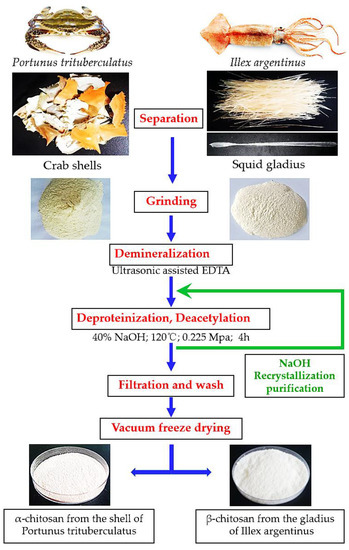 - Cuong, H.N.; Minh, N.C.; Hoa, N.V.; Trung, T.S. Preparation and characterization of high purity β-chitin from squid pens (Loligo chenisis). Int. J. Biol. Macromol. 2016, 93, 442–447. [Google Scholar] [CrossRef] [PubMed]
