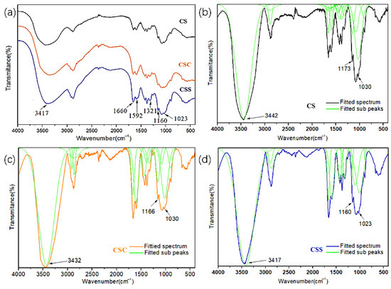 FT-IR spectra of chitosan (a) and fitted FT-IR spectra of CS (b), CSC (c), CSS (d).