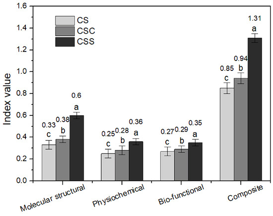 Composite index of chitosan biochemistry performance. Different lowercase letters under the data in the same group indicate significant difference (p < 0.05).