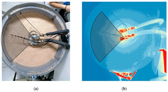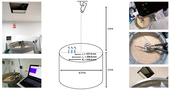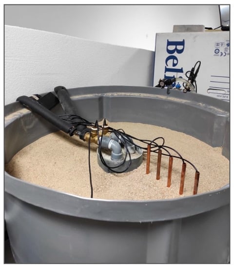 The camera is installed on top of the borehole heat exchanger, at a distance of 1.4 m from the surface of the sand. The geometry of the temperature sensors used and the container are shown in Figure 3, and more details are given in Reference [33].