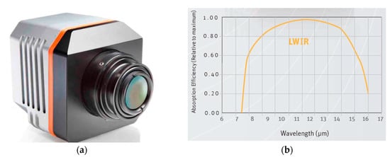 Uncooled infrared thermal camera, Gobi-384 (a), and the LWIR (long-wave infrared) spectral response (b).