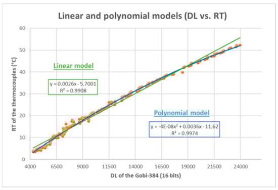 Regarding the calibration model, both the linear and polynomial models (Equations (12) and (13)) were tested since they are widely used to perform temperature adjustments [24].