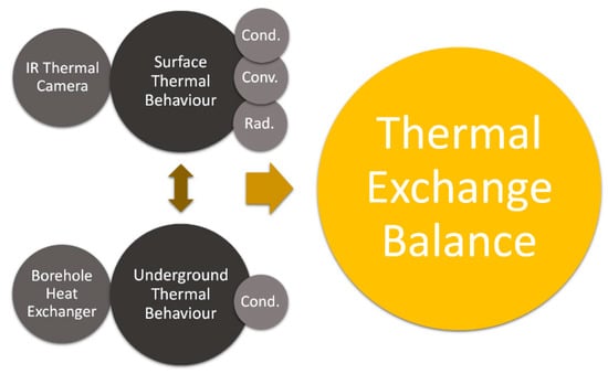 The objective of integrating the experimental borehole heat exchanger with the infrared thermal camera is obtaining a global thermal model that allows evaluating all the thermal mechanisms (usually extremely difficult to define) that take place in a geothermal system. As already explained, the temperature monitoring in the borehole heat exchanger enables the calculation of the ground thermal conductivity (sand) since only conduction effects appear in depth. However, when measuring with the infrared thermal camera (surface temperature), the three main thermal transfer mechanisms are detected (Figure 6).