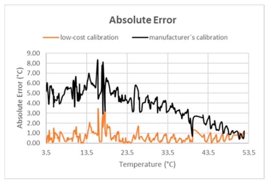 Absolute errors obtained when comparing temperatures calculated by the low-cost and the manufacturer calibration with respect to the reference temperatures measured with thermocouples.