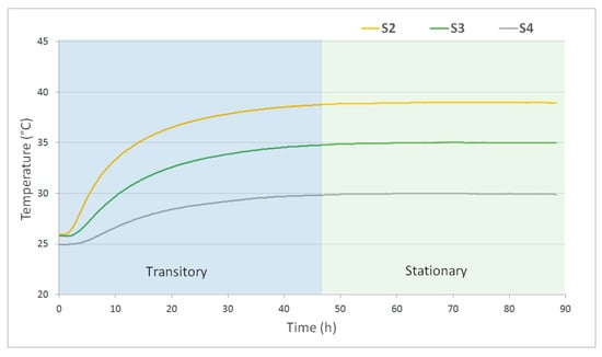 Temperature sensors S2, S3 and S4 were the ones used for the estimation of the heat conduction in depth and the thermal conductivity of the filling material. The selection of these sensors, located in the copper tubes of the experimental setup at the depth of 0.5 m, was made with the aim of avoiding thermal influences from the heat source and covering the central area of the sandy material (dismissing the registers in the middle and the opposite end of the setup). The results of the measurements of the sensors can be observed in Figure 9.