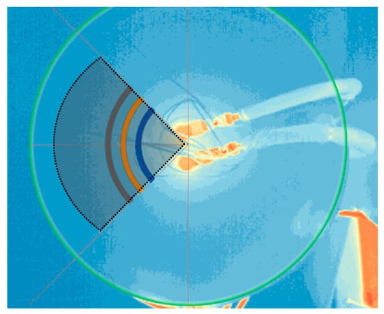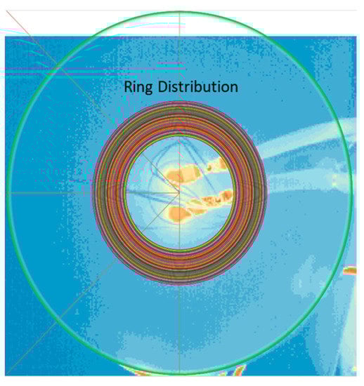 When trying to determine the total convection heat rate in the case under study, it is important to consider the variation of the air temperature. For including this variation in the calculation, the region between the sensors under study (S2–S4) was divided into a series of rings (Figure 10). As shown in Figure 9, each ring selected in the area between sensors corresponds to one pixel of the camera.