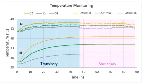 Monitoring of the temperature reached in each inner sensor (S2, S3 and S4) and registered by the thermal camera (TC) at the position of each sensor, as shown in Figure 11 (S2fromTC, S3fromTC and S4fromTC).