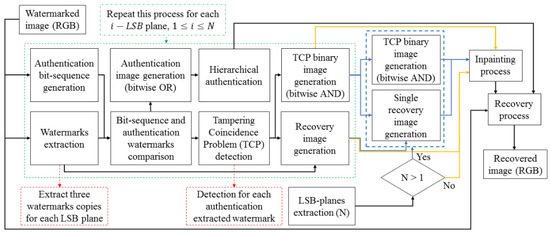 This section describes the authentication and reconstruction process of a given tampered image of size in RGB color space. To accomplish this reconstruction, four steps are used: extraction of the watermarks from the image, authentication of the content, post-processing to indicate the blocks affected by the tampering coincidence problem via an inpainting process to fill these regions and reconstruction of the tampered image.