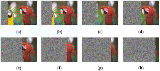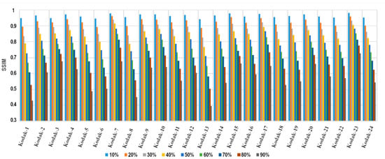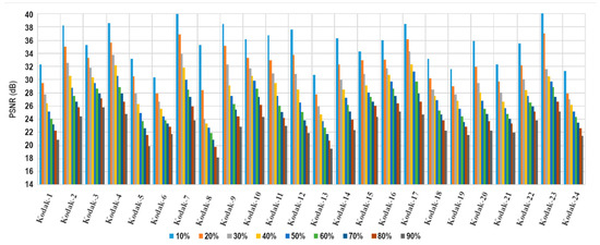 To perform a visual comparison, the image Kodak-15 was employed. Its modifications can be observed in Figure 13. This comparison is illustrated in Table 9 and Table 10, where Table 9 presents the results for the alteration rates between 20% and 50%, and Table 10 shows the results for alteration rates between 60% and 90%.