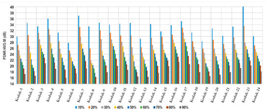 The results given in Table 10 show a dramatic fall in quality for the state-of-the-art methods, while SR-HTR maintains an acceptable visual quality proficiency until 90% when the Kodak-15 image is modified. The second-best results belong to [36], which degrades the image quality but still visibly preserves the original content. This decrease in quality for the state-of-the-art methods is due to the low level of redundancy inserted for the reconstruction watermark, which corresponds to the insertion of up to two copies, such as in [10,23]. However, the framework [23] presents a larger number of contiguous pixels without reconstruction compared with [10] because it uses the SPITH compression algorithm with pixel blocks to generate the reconstruction bits. This method is sensitive to noise applied to the blocks. Therefore, the decompression algorithm will result in wrong values for the whole block with minimal modification of the reconstruction bits.
