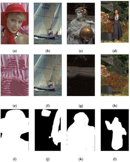 Multiple and irregular alterations, (a) Kodak-4 original, (b) Kodak-10 original, (c) Kodak-17 original, (d) Kodak-18 original, (e) Kodak-4 modified, (f) Kodak-10 modified, (g) Kodak-17 modified, (h) Kodak-18 modified, (i) Kodak-4 ground truth, (j) Kodak-10 ground truth, (k) Kodak-17 ground truth, (l) Kodak-18 ground truth.
