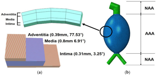 All finite element models created in this study simulated the curved surfaces based on previous measurements. All models were generated from the common iliac artery to the renal artery. The neck length differs among patients; as such, it was assumed to be 30 mm. Moreover, Azar et al. [20] suggested the gradual reduction of the proximal diameter of the iliac artery from 13 to 10.3 mm along the considered length of the vessel. In addition, the aortic wall thickness was set as 1.5 mm using the average aortic wall thickness suggested by Raghavan et al. [25]. The arterial wall was divided into three layers with different thicknesses and fiber directions: intima, media, and adventitia. The fiber direction orientation and thickness in these layers were set as the experimental mean values suggested by Niestrawska et al. [22]. The thickness of each layer of the aorta was set to 0.31, 0.8, and 0.39 mm (intima, media, and adventitia, respectively), which were 0.21%, 0.53%, and 26% of the entire aortic thickness. The fiber direction’s orientation in the intima, media, and adventitia was set as 3.25°, 6.91°, and 77.53°, respectively. In the modeling stage, the neck and iliac arteries were classified as normal tissues based on the diameter of the aorta, and the swollen section was classified as an AAA tissue. The divided model and information on each layer of the arterial wall are shown in Figure 3.