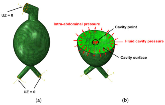 Figure 4 presents the boundary and loading conditions. To prevent the applied model from moving and thus preserve the diameter expansion of the ring part, a reference point was set at the center of the ring (top and bottom of the model). The cylindrical coordinate system was set, and the degree of freedom in the z-axis direction was fixed. In addition, a fluid cavity was used to simulate blood pressure. First, a reference point was designated at the center of the model, and the cavity point was set at that position; the inner wall was set as the cavity surface. A uniform pressure of 120 mm Hg (16 kPa) was applied as the maximum systolic blood pressure in the cardiac cycle. In addition, a uniform pressure of 7 mm Hg (0.93 kPa) was applied to the inner wall to express the abdominal pressure. The density of the inner fluid and bulk modulus of blood were set as 1.06 × 10−9 t/mm3 and 2.66 GPa, respectively [26,27].