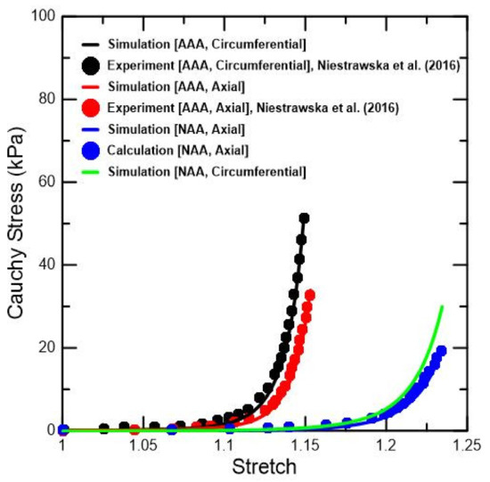 In this examination step for material behavior, the results of the aforementioned experiments were used in combination, because the load conditions were not clearly presented in the experiment of Geest et al. [21], and Niestrawska et al. [22] only conducted tests on AAA samples. In particular, the ratios of the tensile stress and stretch were compared between NAA and AAA, based on the experimental results derived with a tension ratio of 1:1 in the test of Geest et al. [21]. Additionally, based on these ratios in the test of Geest et al. [21] and the test results for AAA samples in Niestrawska et al.’s experiment [22], the stress, stretch, and elasticity of NAA samples were estimated. These results were applied in the calculation step of the material parameter in the constitutive model.