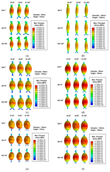 Maximum principal stress contour in inner wall. (a) Diameter: 40 mm; height: 110 mm; (b) diameter: 40 mm; height: 190 mm; (c) diameter: 80 mm; height: 110 mm; (d) diameter: 80 mm; height: 190 mm; (e) diameter: 120 mm; height: 110 mm; and (f) diameter: 120 mm; height: 190 mm.